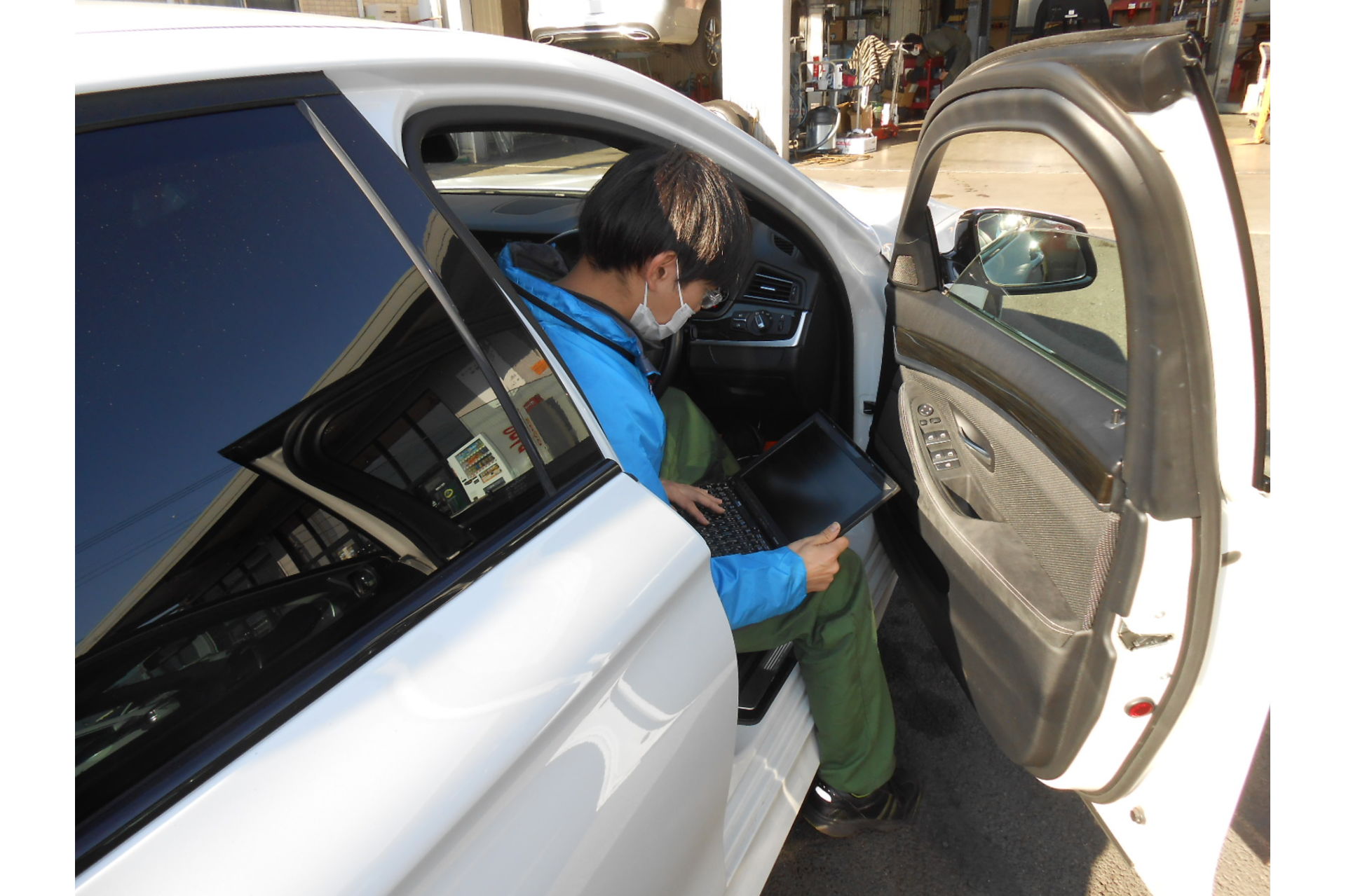 更に空きスペースでは、チェックランプが点灯した F10 BMWをテスター診断しています。