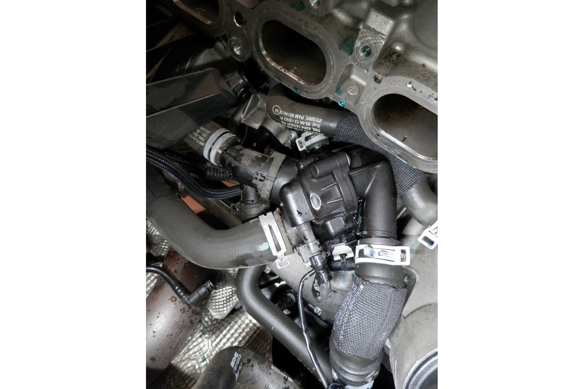 さすがAMG!エンジンルームもカッコイイです。さて肝心のサーモスタットですがぱっと見ですと、どこにあるかわかりません。