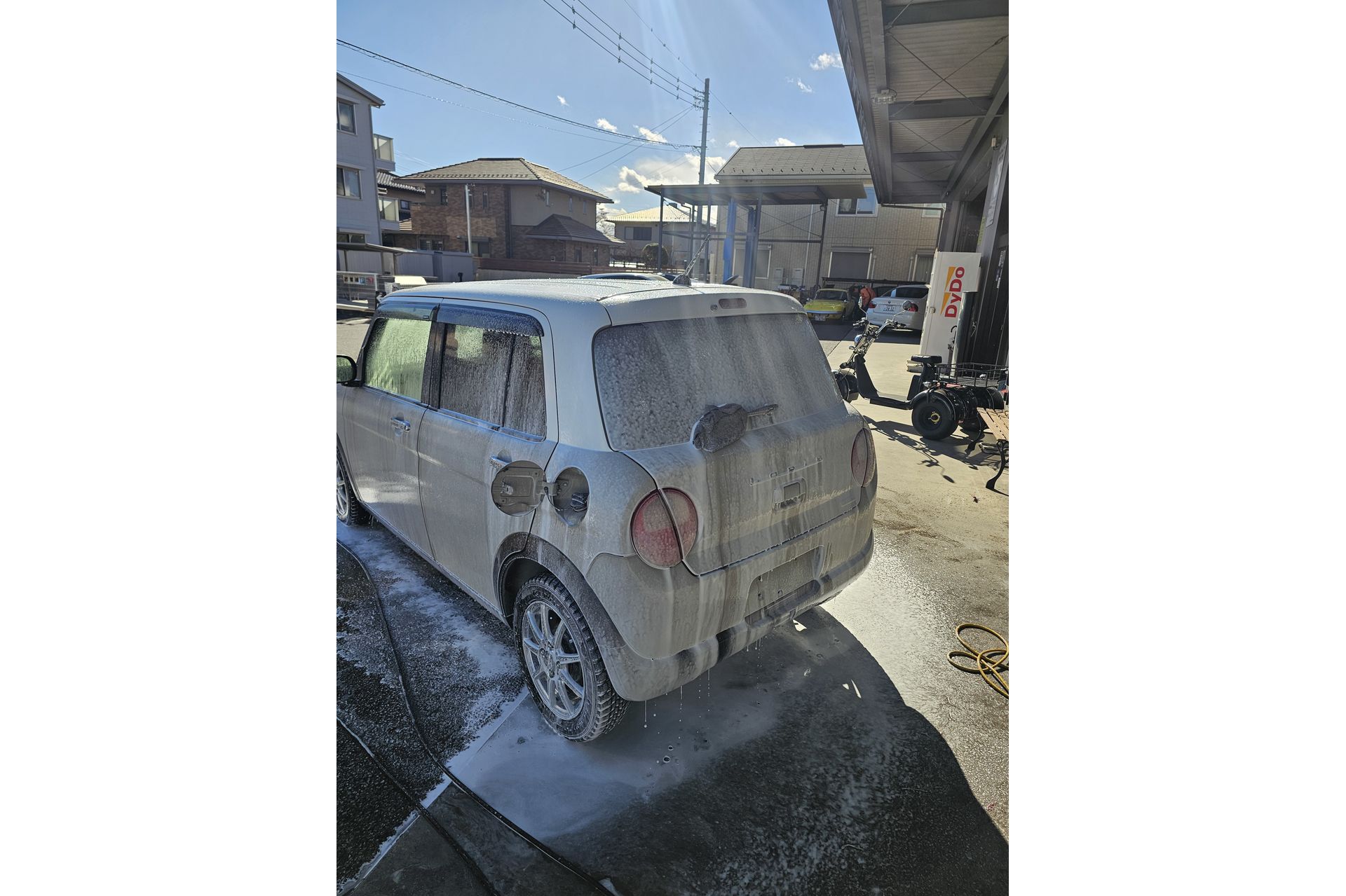 泡を流す際には高圧洗浄機よりもホースで流す方が非常に効率がいいです。ある程度高圧洗浄機で流したら仕上げはシャワーで!